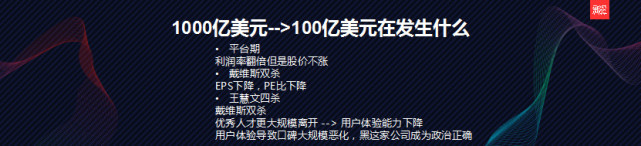 这个更大规模员工的离开导致一个后果,就是做好用户体验的能力下降了,这是第三步。然后因为做好用户体验本身能力下降,进一步带来的就是整个用户口碑的恶化。用户口碑的大幅恶化之后,带来了最后的效果——黑这家公司变成一个政治正确的行为,不管这家公司做什么事是对还是不对,大家都认为是错。所以这时候,公众、媒体都觉得这家公司该打,要人人喊打。所以这时候进入了一个非常糟糕的恶性循环,这个恶性循环四步是会反复的,最后形成共振。这个事情发生的时候,整个的业务和公司就掉进一个深渊了。所以这是我后来看巴菲特、芒格他俩不投科技公司非常重要的原因。因为科技公司下半段非常恐怖,他俩的预测方法很难抓住科技公司什么时候(股价)下来。这是 1000 亿到 100 亿这个回合发生的事情。