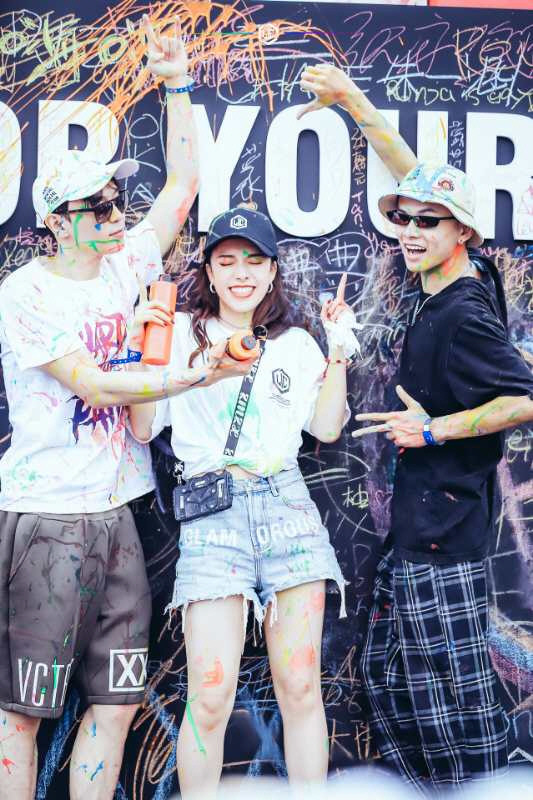 活动中更加别出心裁的是,除了常规的电音舞台之外,主办方还增设了许多颇具潮流的小惊喜,白色巨型泳池、蓝色冲浪滑板,粉色跷跷板,还有各种网红自拍打卡装置……作为年轻人畅快互动的聚集地,吴静怡还在现场遇到了圈内好友艾克里里和李泽,三人在涂鸦墙前帅气合影,亮眼吸睛。