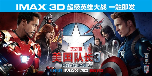 5月6日,由美国漫威影业公司出品的超级英雄大片《美国队长3》将登陆中国约290家IMAX影院。作为《复仇者联盟2》之后最强阵容的漫威超级英雄集结,再加上火热的映前造势和首轮提前场爆出的超高口碑都让《美国队长3》成为整个5月最引人关注的IMAX超级大片。
