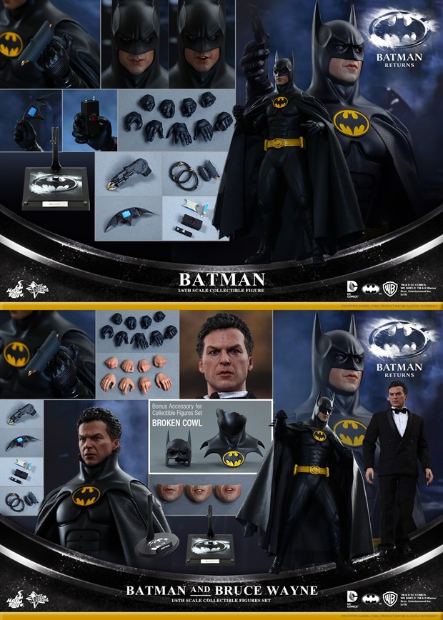 Hot Toys即将推出《蝙蝠侠归来》1:6比例珍藏人偶,全新的蝙蝠侠及布鲁斯韦恩已于近日开始预定。蝙蝠侠备有可动眼,三款可替换嘴型,多款武器设备及LED发光地台。套装中的布鲁斯韦恩则备有参照迈克尔·基顿打造的精美头雕,精细剪裁的礼服,战损蝙蝠侠面罩及上身肩甲。丰富配件完美造型,是蝙蝠侠粉丝们不可错过的收藏珍品。