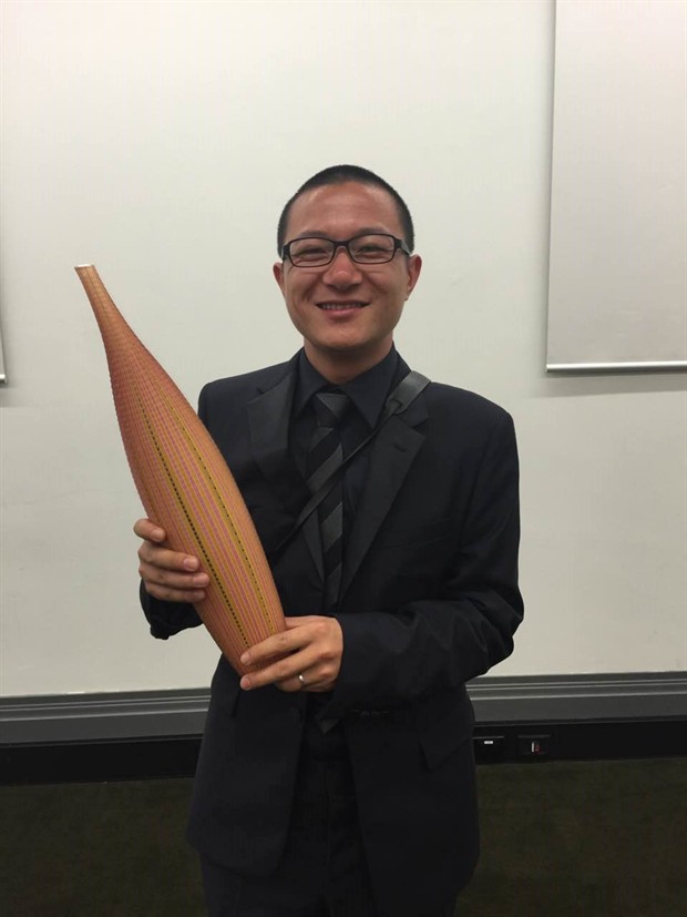 《推拿》获得“评审团大奖”,图为娄烨御用摄影师曾剑手持奖杯。