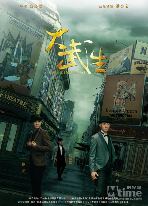 此次曝光的风云款海报,是《大武生》主人公以及片中场景的正式亮相:在民国初年上海滩十里洋场的繁华街头下,两大戏院逼仄相对,上空密布着诡谲阴云,气势压抑低沉。而空无一人的街道上,身着民国服装的吴尊、韩庚,表情凝重紧张,大S徐熙媛则神秘隐藏于二者身后,三人之间精心安排的位置保持着令人窒息的平衡。两大戏院上各高悬武生与武旦的巨幅海报,则隔空对峙,似乎预示了三位主演间的冲突如箭在弦。