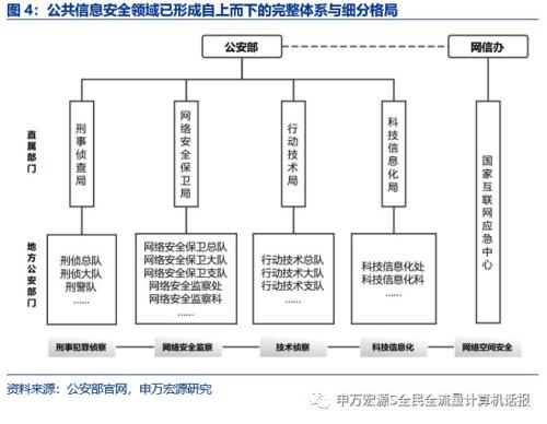 公共信息安全领域已形成自上而下的完整体系与细分格局。我国公共安全领域的监管与政策制定主要由公安部和国家网信办主导:公安部覆盖刑事犯罪侦查、网络安全监察、技术侦察以及科技信息化等;网信办覆盖网络空间安全(国家计算机网络与信息安全管理中心 )。各细分领域形成产业生态,构成“大安全”格局。