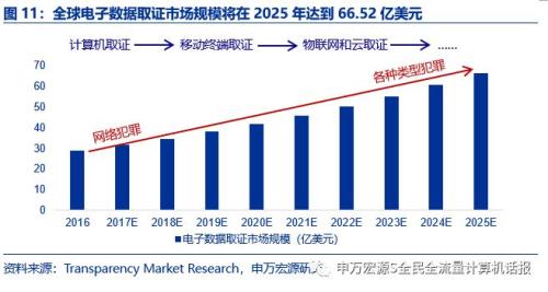 全球视角下,取证赛道也向不同行业延伸,通向信息产业巨大蓝海。美国取证专家Mark Pollitt博士在《A history of digital forensic》中提出,电子取证将不再仅专注于恢复数据的线性过程,而是基于证据的知识管理过程,且将被整合到调查、情报分析、信息安全和政府信息交换中。据TMR,2016年全球取证市场规模在28.7亿美元,广泛渗透至医疗、金融、国防、运输等领域;2025年全球取证市场规模将达66.52亿美元,CAGR 9.7%。
