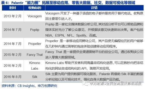 “能力圈”进一步拓展,外延积极并购,大数据扩展至大众领域。2013年开始,Palantir先后收购社交媒体、移动应用、零售、可视化等领域的创业公司,从政府、金融领域扩展至能源、消费品、交运、医疗等行业,重要客户包括英国石油公司、空中客车集团、默克医疗集团、好时巧克力等,体现“能力圈”成功拓展。