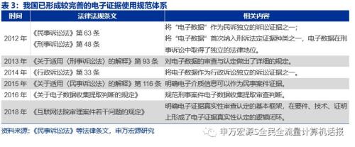 电子证据的使用已形成法律规范,极大拉动电子数据取证需求。2015年最高院首次明确电子介质信息可以作为民事案件证据。2018年以来,杭州互联网法院上线全国首个电子证据平台,广州南沙人民法院出台互联网电子数据证据规范。尤其2018年9月最高院发布《互联网法院审理案件若干问题的规定》奠定了电子证据真实性审查认定的基本框架,系列法规明确了电子证据合法性与使用规范,电子数据取证需求迅速提升。