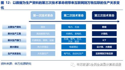 数据是第三次技术革命的重要生产资料,数据公司将享受价值红利。石油、煤炭等矿藏实际是数十亿年太阳能量的积累与转化,并在自然界循环,数据也类似。来自物理世界的数据在网络空间汇集、处理、沉淀,最终又在物理世界体现价值。与蒸汽时代、电力时代的技术革命相仿,数据作为数据公司的生产资料,将借助云计算和大数据,在生产关系向万物互联演进的浪潮中享受红利。