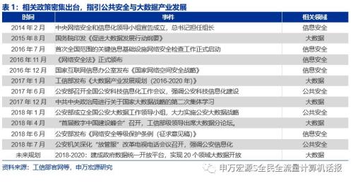 与安全产业结合,顶层设计指引我国大数据进入新周期。2014年中央网络安全和信息化小组成立后,《促进大数据发展行动纲要》、《网络安全法》等若干政策密集发布,规划到2018年底前建成国家政府数据统一开放平台,2020年底前实现政府数据集向社会开放,高层布局说明公共安全和大数据已上升至国家意志层面。