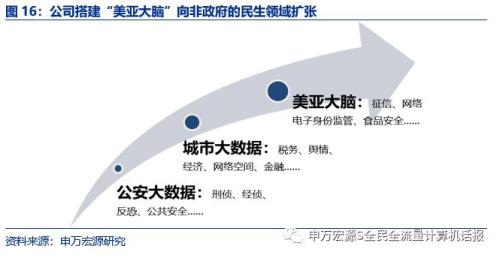 市场认为,美亚柏科行业拓展能力有限,我们认为“城市大数据”、“美亚大脑”平台已经证明公司基于大数据平台的能力、AI能力,且已将业务延伸至征信、网络电子身份监管、食品安全等民生领域,未来从to G、to B到to C,赋予大数据信息化广阔想象空间。
