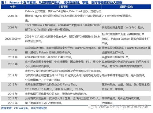 (2)扩张期:产品化后赛道复制,估值持续高增。Palantir在政府、金融两大拳头领域保持“能力圈”稳固,以外延并购创业公司的方式“造血”,进一步渗透至保险、医疗、社交、零售等领域。2018年估值200亿美元,在全球独角兽榜单列第五位 。