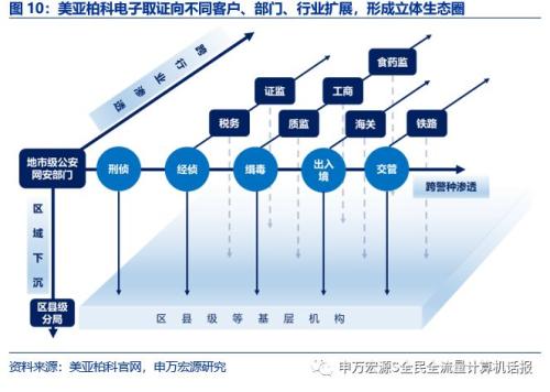 美亚柏科在国内电子数据取证行业市占率近50%,向不同层级、部门、行业扩展。目前我国行政区划1636个区县渗透率均低;2013年开始向多警种一次渗透,2019年刑侦实验室是突破重点;向税务、工商、海关等不同行业二次渗透。