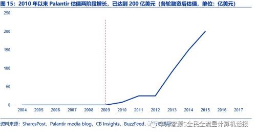 (1)成长期:服务产品化,估值第一轮增长以拓展金融大数据为标志。不考虑初期CIA内部消化市场,从2010年开始Palantir陆续与金融客户签署大额长期合同,订单金额在500万至2000万美元,2010年实现收入5000万美元。