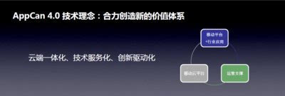 AppCan发展到现在融合了AppCan4.0的技术理念,究其根本还是想创造一个完整的价值体系。公司要生存发展,必须要有商业模式,一方面要考虑到自己的价值体系,另外也要给客户创造价值。而要围绕AppCan4.0创造新的价值体系,云端一体化、技术服务化、创新驱动化是其核心关键。