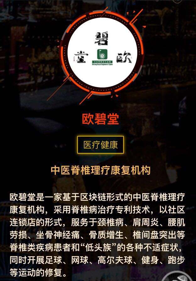 欧碧堂,是一家基于区块链的中医脊椎康复连锁公司,用脊椎类慢病诊疗专利技术和药物,